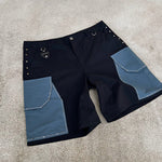 Traditional cargo short silhouette with our new wider, baggier fit. Made of premium polyester nylon in a contrast two tone, finished off with rhinestone embellishments along the cargo pockets and silver flat head studs along the side pocket openings.