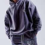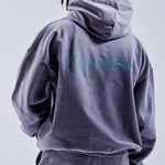 Premium cotton hooded sweatshirt with custom fabric weight and blend, highlighted custom embroidered logo motif on front chest and large rear back graphic. Subtle width added and minimal crop, fits true to size. Model is 6’0 wearing a size Large.