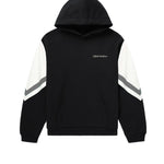 Premium cotton hooded sweatshirt with custom fabric weight and blend, highlighted with color block paneling and large embroidery and chenille patchwork. Hood features a zip down capability that converts into a shoulder shroud. Fits true to size. Model is 6’0 wearing a size Large.
