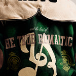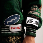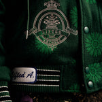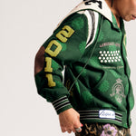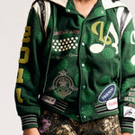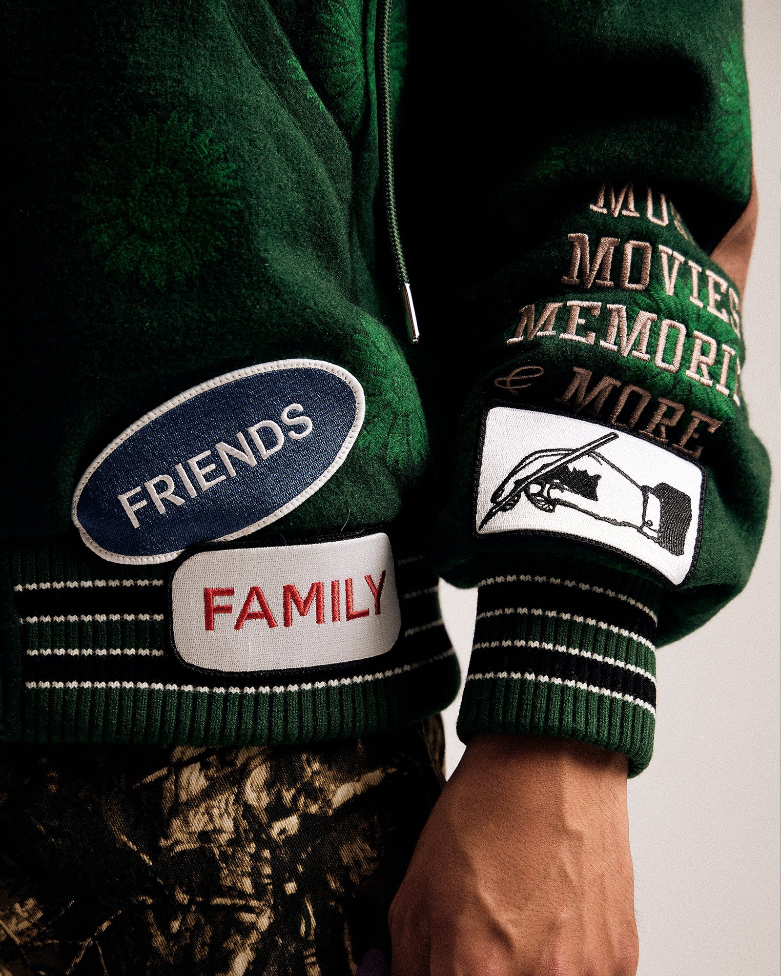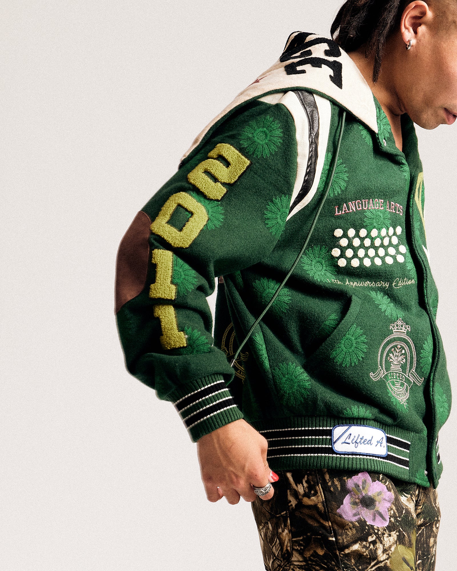 Traditional Letterman Jacket with hood that zips open converting to a shoulder shroud. Shell is made of high quality wool with an all over tonal floral embroidery print. Features a mix of large embroidery, chenille and canvas twill patchwork throughout the entire garment, and also features vegan leather shoulder striping. Fits true to size. Model is 6’0 wearing a size Large.