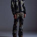 A rare and unique clash of camouflage, argyle and denim specially developed for SP25 - A mixed variety of traditional camouflage patterns, sectioned and reconstructed with different dark tones of denim into a raw seam argyle pattern. Quality and finish are as good as it comes on the market.