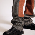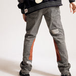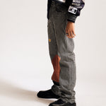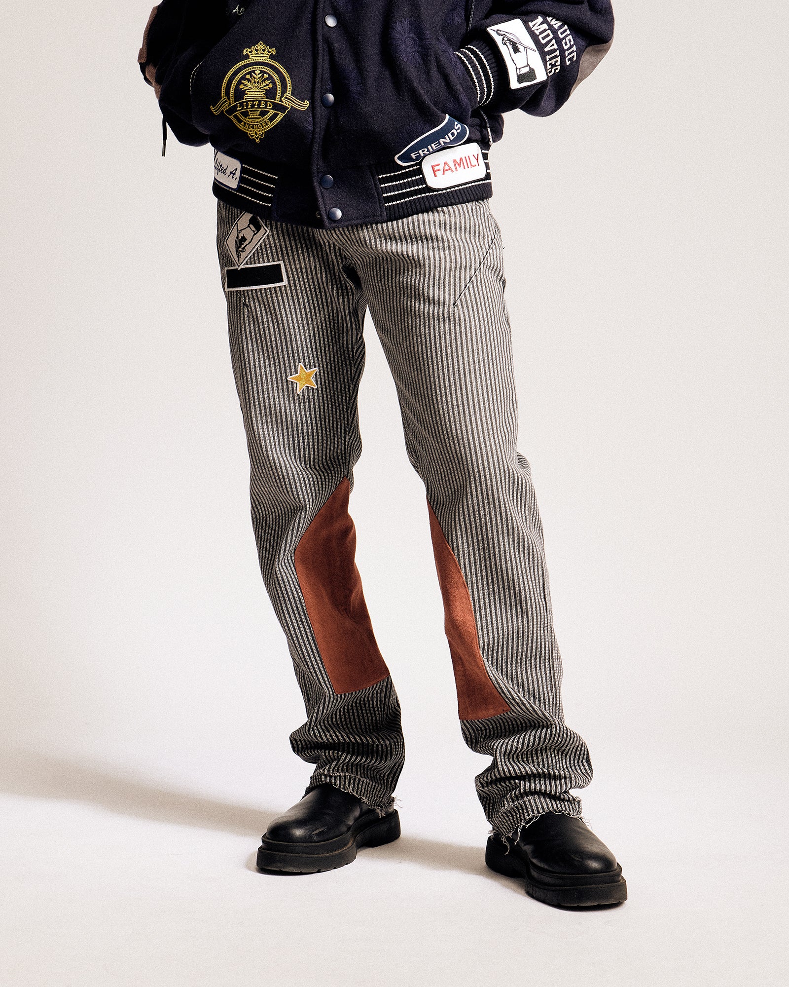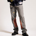 Traditional straight leg denim featuring unique suede “riders patches” on the inner leg panels. Also features blank twill canvas collection concept patchwork and a raw edge hem. Fits true to size. Model is 6’0 wearing a size 32.
